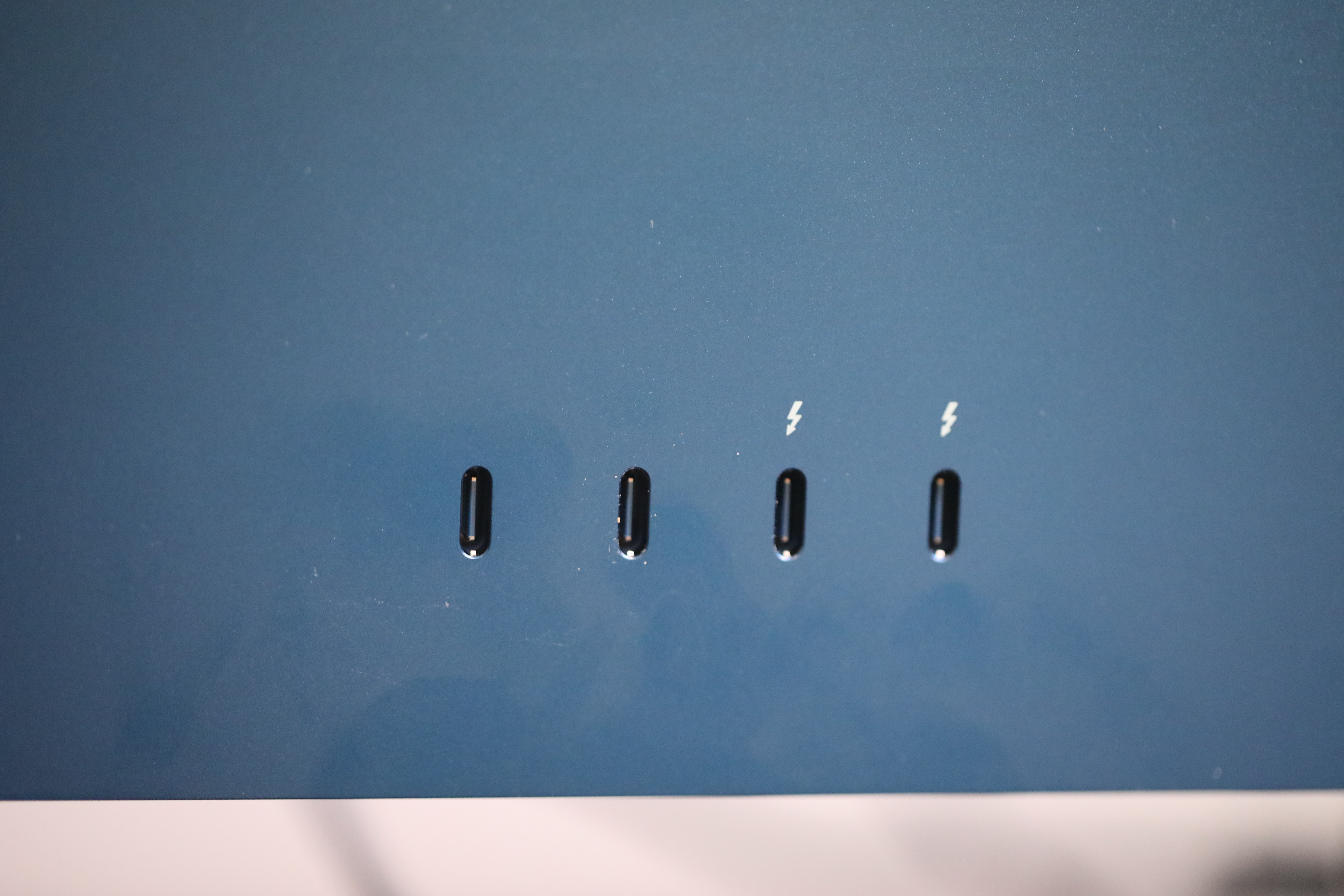 Nothing has changed as far as footprint. It’s the same little iMac we got in 2021, available in the same color options as before: blue, green, red, silver, yellow, orange and purple. Apple sent the blue model this time out, which I have to say is an improvement over the yellow I got last time. It’s a light powder blue on the bezel. The metal stand and keyboard both carry a subtle blue hue, while the rear is much deeper. It’s cute. There’s no other word, for it, really. Just cute.