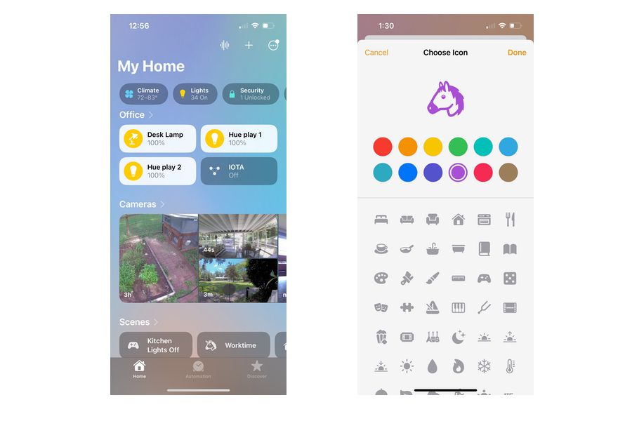 The other new customization options are a few more icon options for lighting, shades, and smart plugs (although still not as many as I’d like) and a plethora of new icons for Scenes. There are even unicorns. Plus, you can now pick a color for your Scene Icon. I have a purple unicorn for my Worktime scene. But when the color appears is a bit random. It seems to be once a scene has successfully run or when it can be activated. The colors don’t show when the Scene tile is grey.