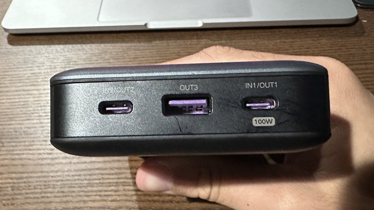 The power bank has two USB-C ports that can serve as in/out ports and one USB-A port. They’re labeled one through three for their charging capability, as port one also has “100W” labeled under it.